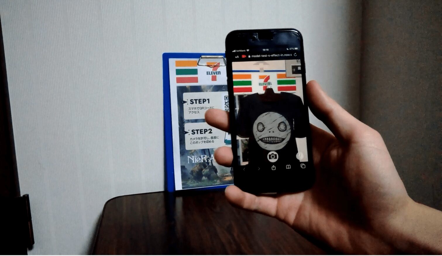 WebARにもいくつか種類があるのですが、携わった案件に適しているのはスマホで行うマーカー型のWebARでした。マーカーとは目印となる画像です。今回は、カメラなどを使ってブラウザに映した現実の映像にマーカーが映っていればその上に3Dモデルを重ねて表示させます。