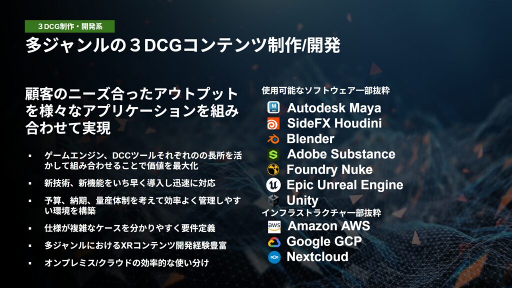 要件定義から実装・運用、パイプライン構築まで、3DCGを核に、コンテンツ開発を一気通貫で支援します。