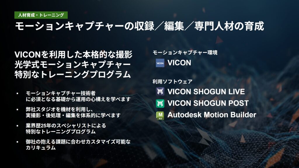 MotionBuilder/VICONを核にした“現場直結型”の企業向け人材育成サービスを提供しています。キャリブレーション〜収録運用〜リターゲット〜クリーンアップ〜ポスト処理を実務フローで習得し、内製化・リスキリングを推進します。品質基準・セキュリティ運用も含め、OJT伴走型で定着まで支援します。