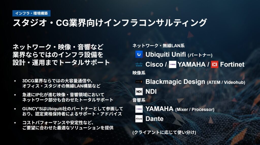 GUNCY'Sは、3DCG・映像コンテンツ領域における“軍師集団”として、プロジェクトの企画段階から技術選定、実行支援まで伴走するコンサルティング事業を中核にスタジオ運営、制作・開発、人材育成まで幅広く展開しています。